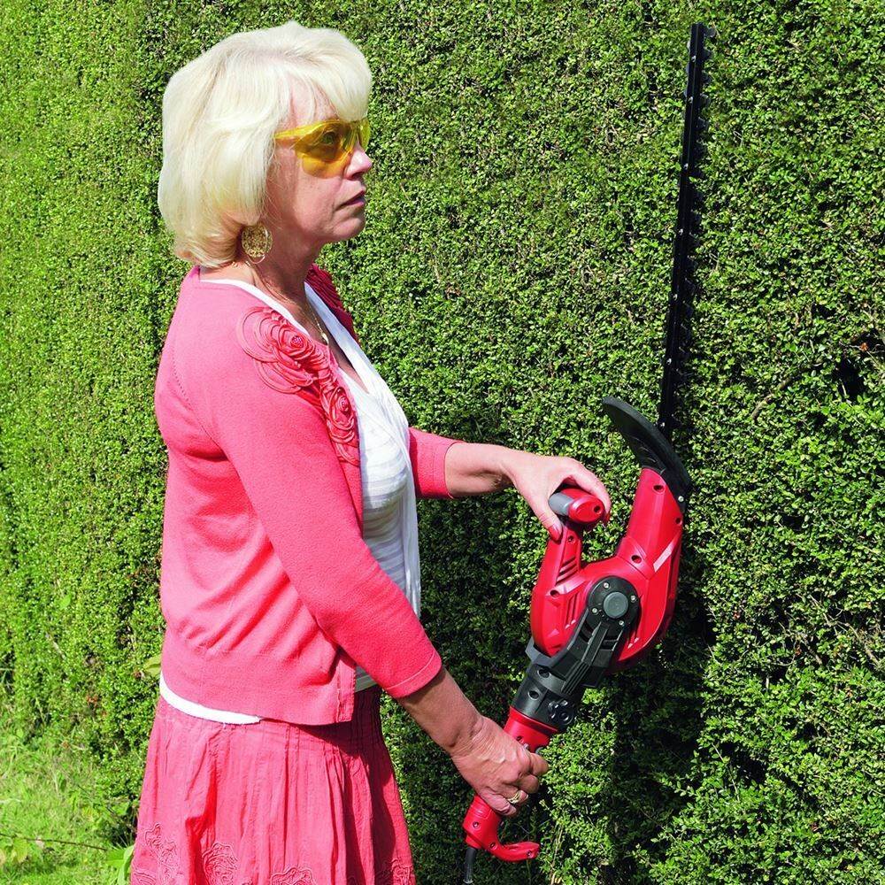 The mains-powered 550W angle-adjustable trimmer head features an extra-long 20½” (52cm) razor-sharp reciprocating blades that can cut through stems up to ½” in diameter at 1600rpm.