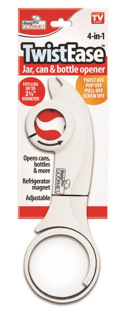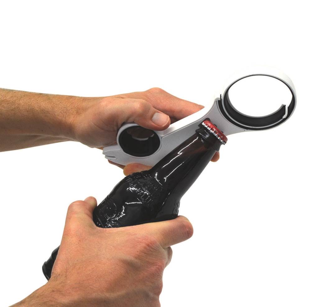 4 tools with one opener – twist open jars 5cm – 6.9cm caps). pop open bottles. pull open cans. and unscrew plastic bottles