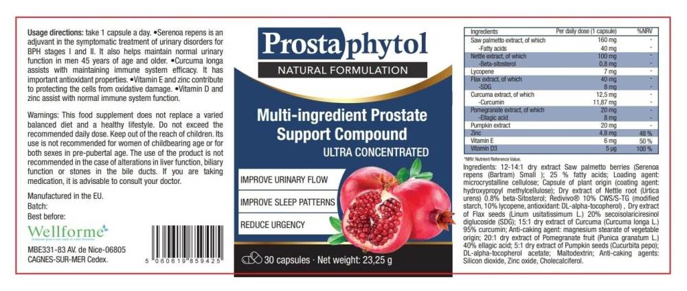 12-14:1 dry extract Saw palmetto berries (Serenoa repens (Bartram) Small ); 30% fatty acids; Loading agent: microcrystalline cellulose; Capsule of plant origin (coating agent: hydroxypropyl methylcellulose); Dry extract of Nettle root (Urtica urens) 0.8% beta-Sitosterol; Redivivo® 10% CWS/S-TG (modified starch. 10% lycopene. antioxidant: DL-alpha-tocopherol) . Dry extract of Flaxseeds (Linum usitatissimum L.) 20% secoisolariciresinol diglucoside (SDG); 15:1 dry extract of Curcuma (Curcuma longa L.) 95% curcumin; Anti-caking agent: magnesium stearate of vegetable origin; 20:1 dry extract of Pomegranate fruit (Punica granatum L.) 40% ellagic acid; 5:1 dry extract of Pumpkin seeds (Cucurbita pepo); DL-alpha-tocopherol acetate; Maltodextrin; Anti-caking agents: Silicon dioxide. Zinc oxide. Cholecalciferol.