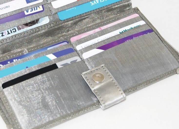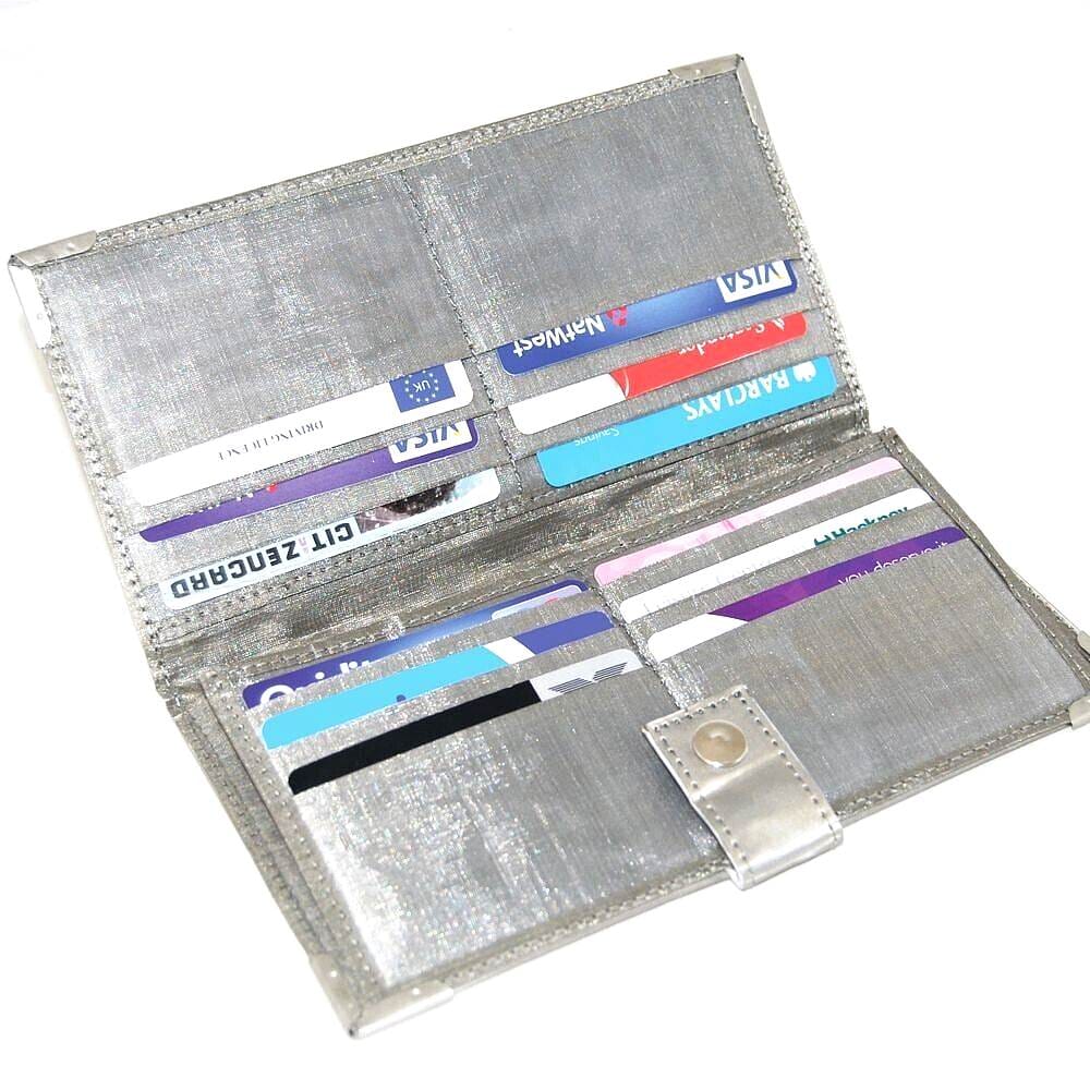 This Stainless Steel Purse has compartments for money. tickets and 12 cards.