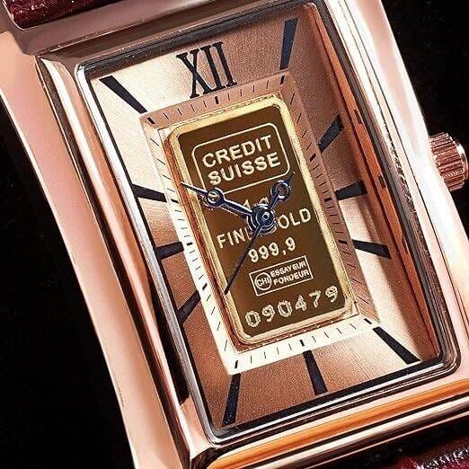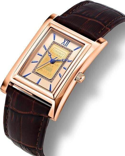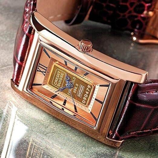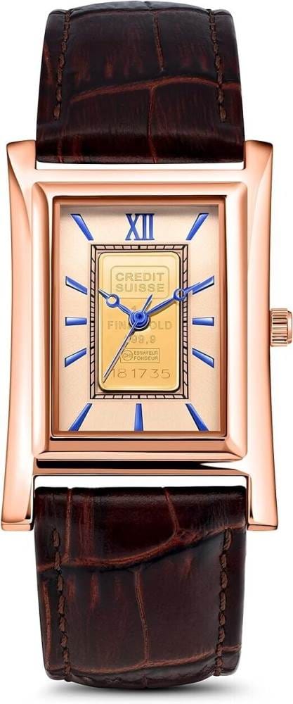 The Alta Gold Ingot Watch boasts a 1-gram ingot of 99.99% pure gold. issued by the world-famous Credit Suisse. Each features a unique serial number and sits at the centre of a radiant. 14 K rose gold-finished dial. The stainless-steel case is luxuriously rose gold-finished and a rectangle of sturdy Cotswold. Crystal protects the elegantly minimalist design. But the Ingot Watch is more than just a pretty face. Inside. you get the luxury of legendary precision with a Swiss Ronda quartz movement. The Alta secures with a genuine leather band and is water-resistant to 3 ATM. Fits wrists 6½”-8½”.