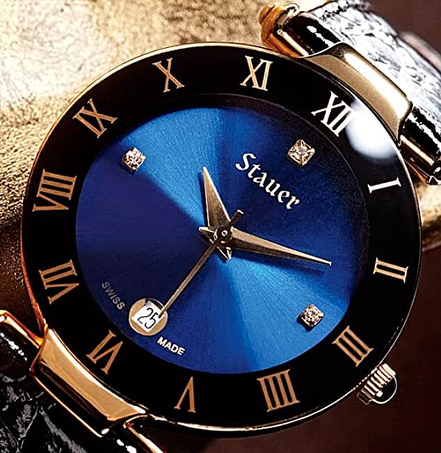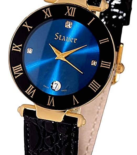 In honor of that perfect Alpine sky. we added sparkle to the metallic blue face with a trio of Austrian crystal rounds at the twelve. three and nine o’clock positions. Golden Roman numerals pop against the rich black of the outer dial and an easy-to-read date window sits at the six. The Stauer Minuit secures with a genuine black leather strap and gold-finished buckle. Even more impressive than its distinctive design is its non-designer price. And for a Swiss-made timepiece. thank your lucky stars. Fits wrists 6¾” – 8″.