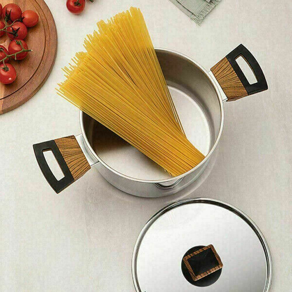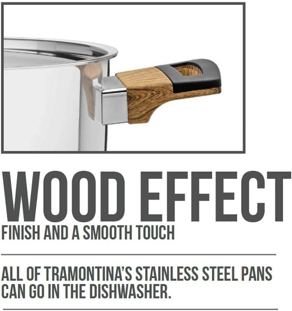 Made from stainless steel. this set features a triple layer base (stainless steel. aluminium. stainless steel) on each piece which distributes heat evenly for faster cooking. The wood effect handles are made from heat-resistant Bakelite. and each lid includes a steam vent for precision cooking.